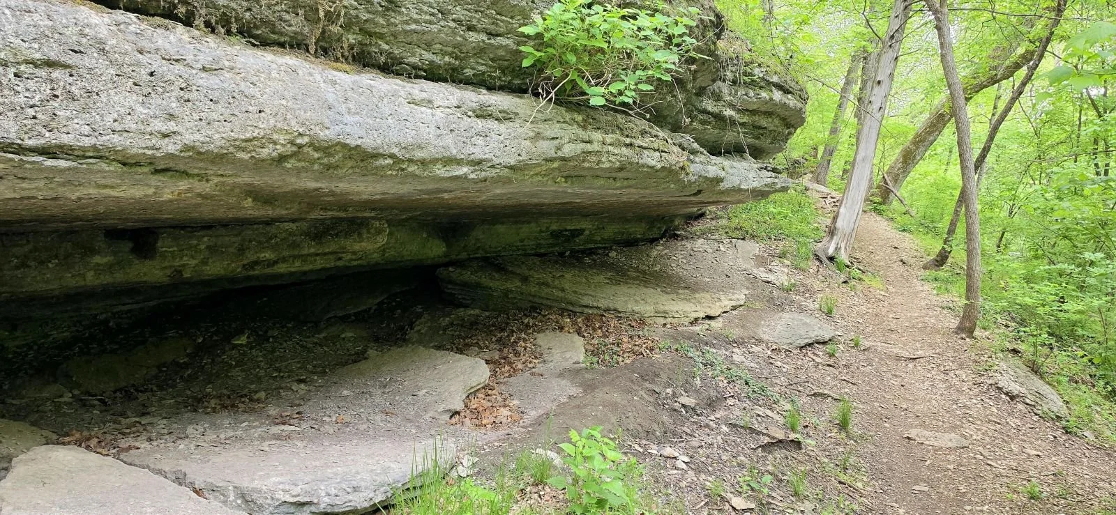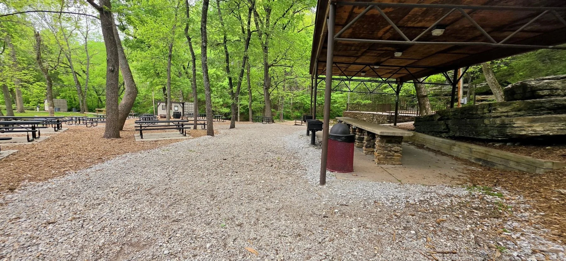 Blowing Springs isn't just a trail system — it's a park. The loop circles the Blowing Springs RV Park and campground, meaning you can camp here and roll directly onto the trail from your site. The park includes picnic areas, a large covered pavilion, caves to explore on foot, and scenery shaped by the same exposed Ozark geology the trail rides through. The natural air-conditioned cave, the overhanging bluff lines, and the spring-fed water features make this one of the most scenic riding destinations in the region regardless of skill level.