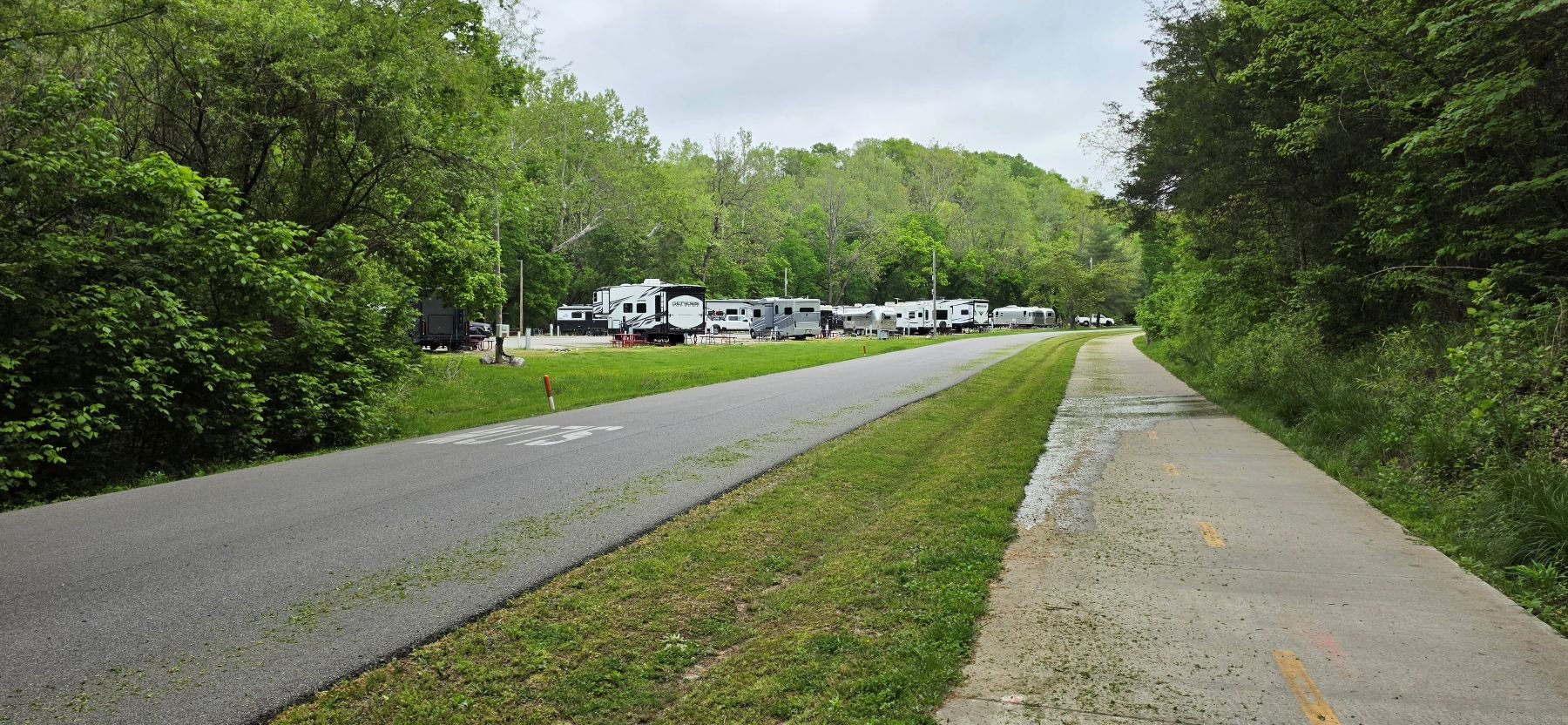The park offers 64 full-service RV sites with 30 and 50-amp hookups, water, electric, sewer, and Wi-Fi included at every site. Big rigs are welcome and the campground operates year-round, making it one of the most practical options for riders who travel with their home on wheels. The sites are efficient and functional — this is trail-access camping, not a resort — but the location more than makes up for it. Trail access, creek access, and downtown Bentonville just a short ride away via the Razorback Greenway.