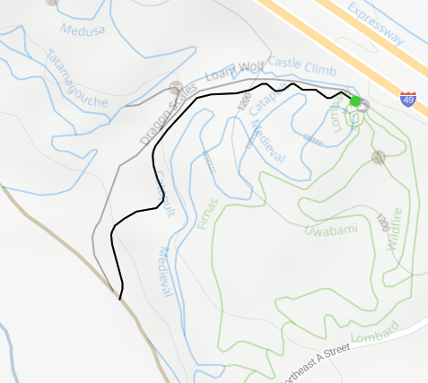 Tip: At the end of Medieval you encounter a fork in the trail. Go straight if you want to return to the castle. If you turn right you will find the gravel road that will take you back to the Skills area.